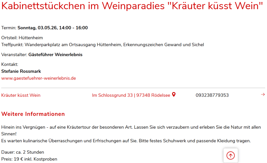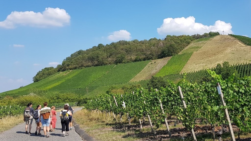 Beginnen möchte ich am Wanderparkplatz am Ortsausgang Hüttenheim in Richtung Tannenberg. Ich nehme Euch mit in unsere Weinberge und zeige euch an einem entlegenen Aussichtspunkt die Besonderheit unseres Tannenberges. Was hat ein römisches Dosenortband mit Hüttenheim zu tun? Neugierig geworden? Dann freue ich mich auf eure Buchung. Damit das Ganze nicht zu trocken wird, kann die Führung mit Weinverköstigung und Kräuterkostproben gebucht werden.